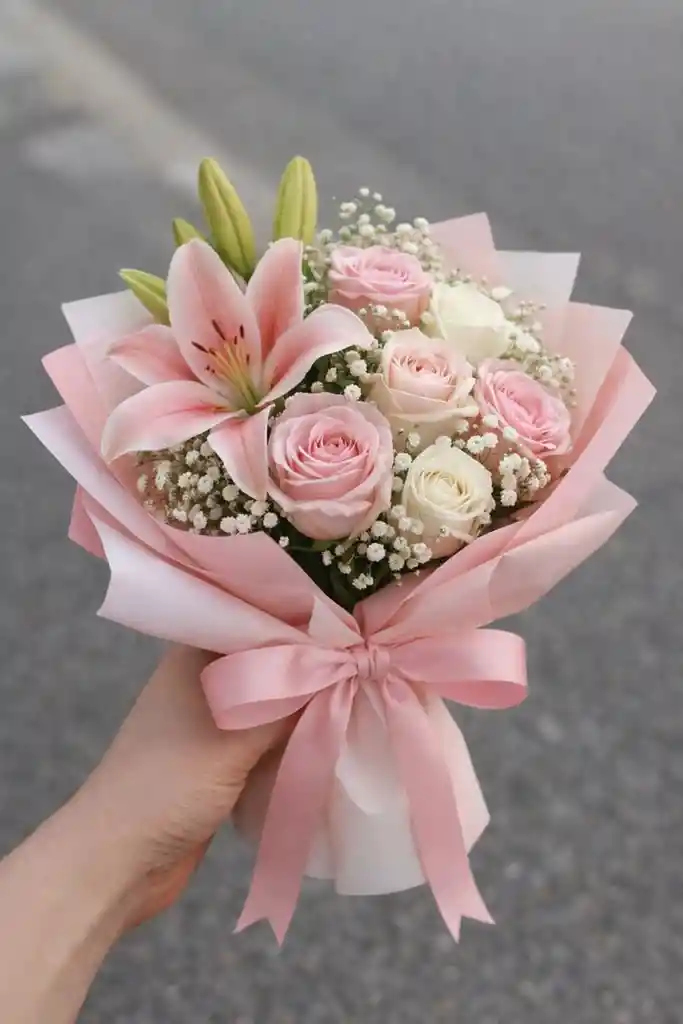La combinación perfecta entre la majestuosidad de los lirios y la dulzura de las rosas. Este ramo artesanal incluye un lirio principal (lilium), rosas en tonos pastel y blanco, complementadas con delicada gipsofilia (lluvia de estrellas). Envuelto en papel coreano de seda con un moño satinado a juego. Un regalo con presencia y un aroma inolvidable. mini ramo