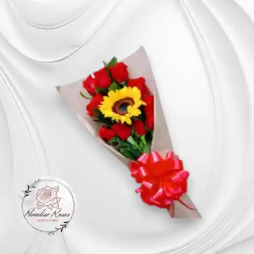 Hermoso ramo que combina 10 elegantes rosas rojas con un girasol, Un arreglo que simboliza amor, alegría y energía positiva, ideal para, Regalos románticos o Sorprender a tu pareja,