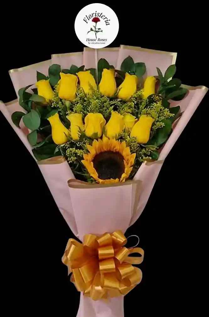 Ramo sofisticado con rosas amarillas, girasol central y follaje verde, envuelto en papel decorativo con lazo dorado. Representa amistad, alegría y buenos deseos.