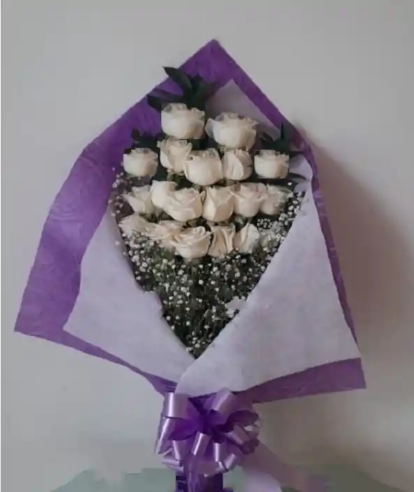 Bouquet de 18 rosas en colores surtidos o en rosas blancas, rojas, amarillas, rosadas, Garantia flor de Exportación, elaborado con diversidad de follajes, contactanos para enviar mensaje de condolencias, descripcion de la cinta y disponibilidad en flores