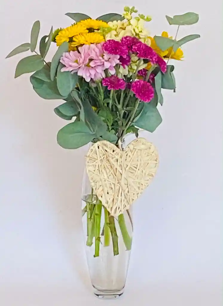Jarrón tabaco de 22 cm de alto con bouquet de flores variadas, viene acompañado con un corazón tejido a mano en fibra.