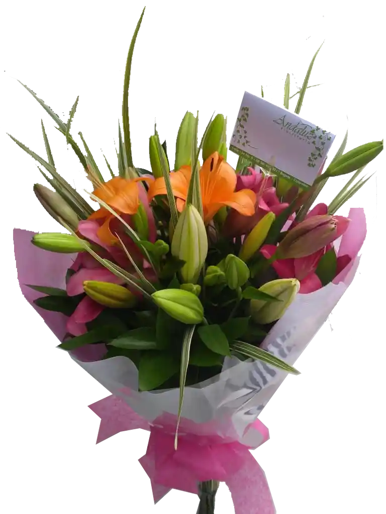 Bouquet por ocho tallos e lirios surtidos, con dos tipos de follajes y decorado. de color Multicolor ideal para el Felicitaciones