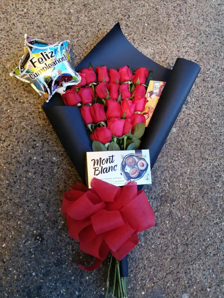 Bouquet en rosa roja, globo metalizado y chocolates Mont Blanc