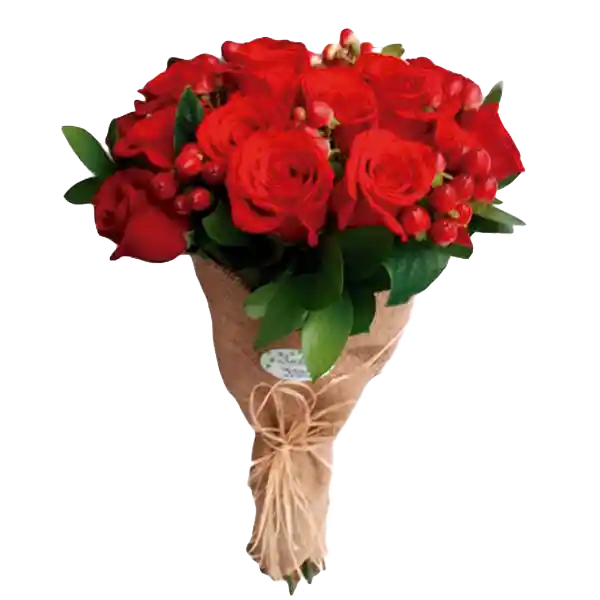 Bouquet en rosas empacado en yute con dos clases de follajes.