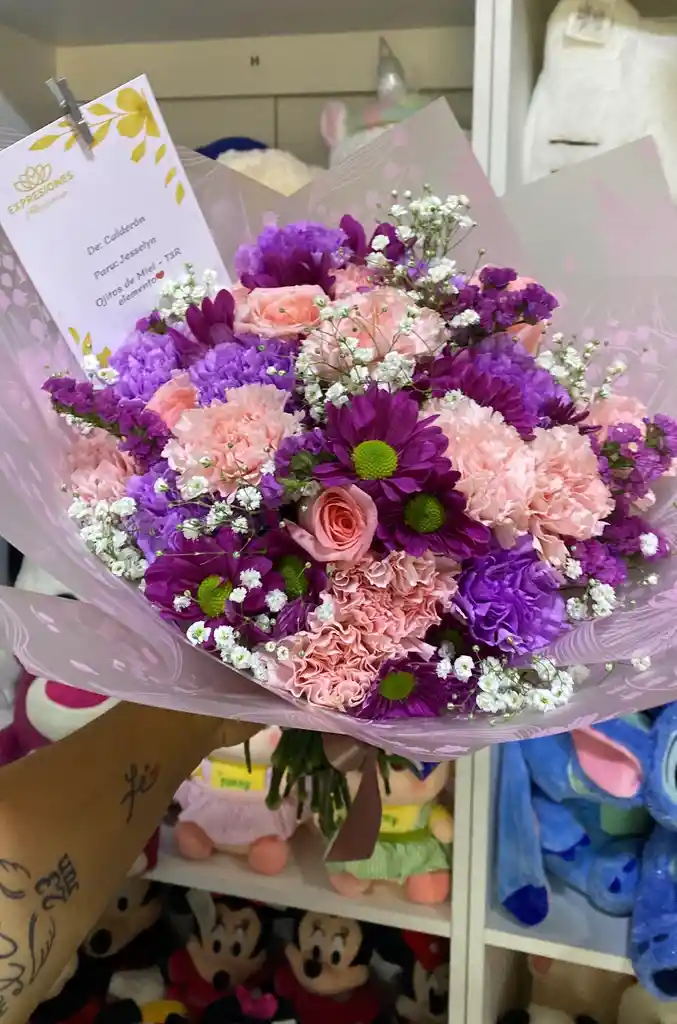 claveles rosas margaritas o pomones colores rosado lila y morado estatis y follajes. Pápel de lujo