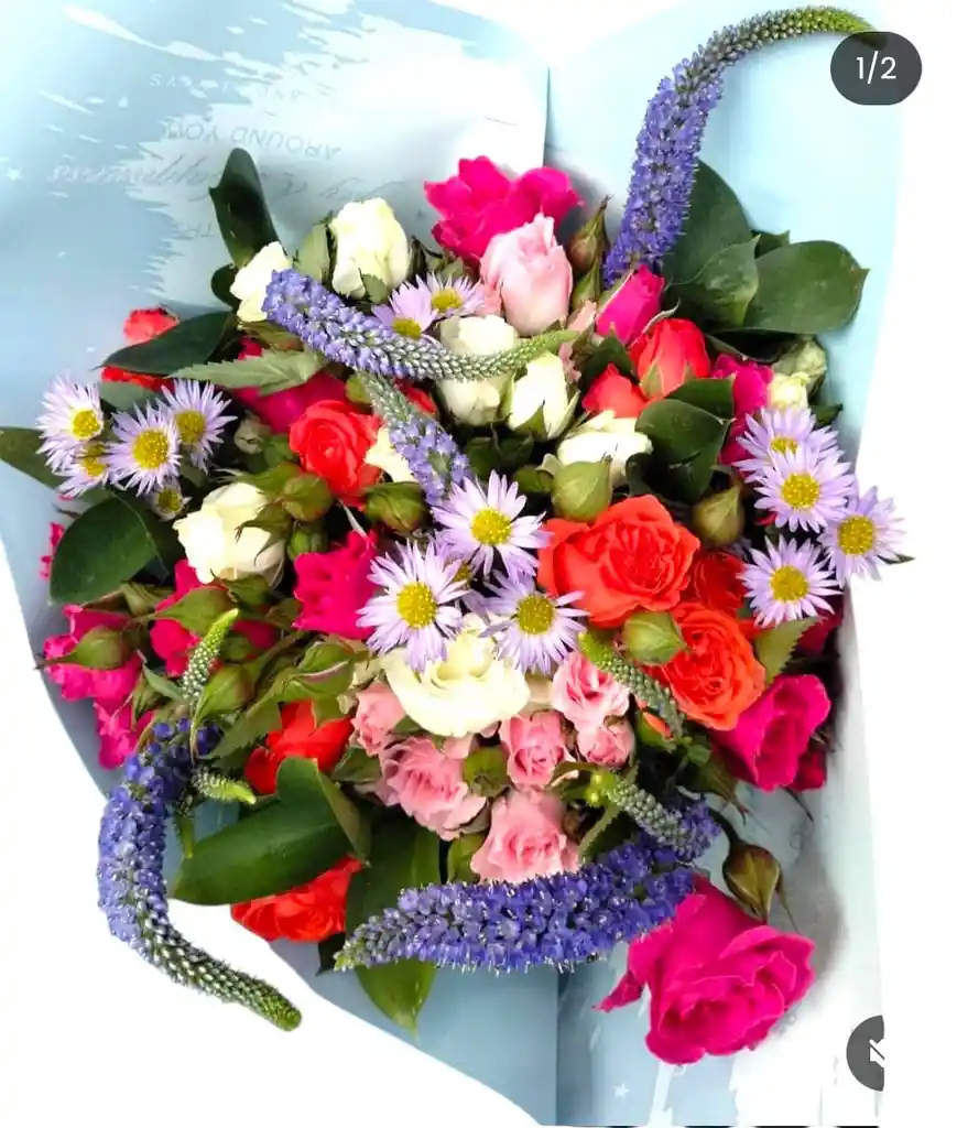 Bouquet flores variadas , contiene ( 20 mini rosas colores surtidos, 5 verónicas moradas, 5 Montecasino lila) empaque coreano azul bebe