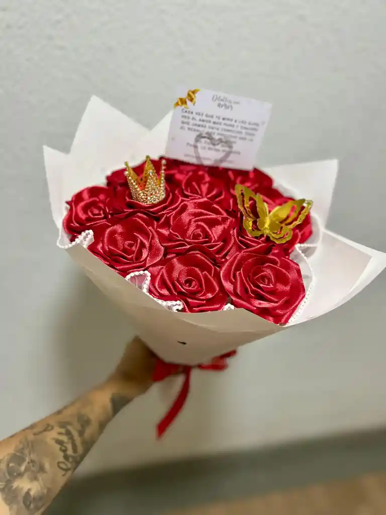 Un regalo que no se marchita, igual que lo representa, ramo de 11 rosas eternas elaboradas con cinta (colores disponibles: Rojo, Blanco, Amarillo, Azul) (Mensaje personalizable)