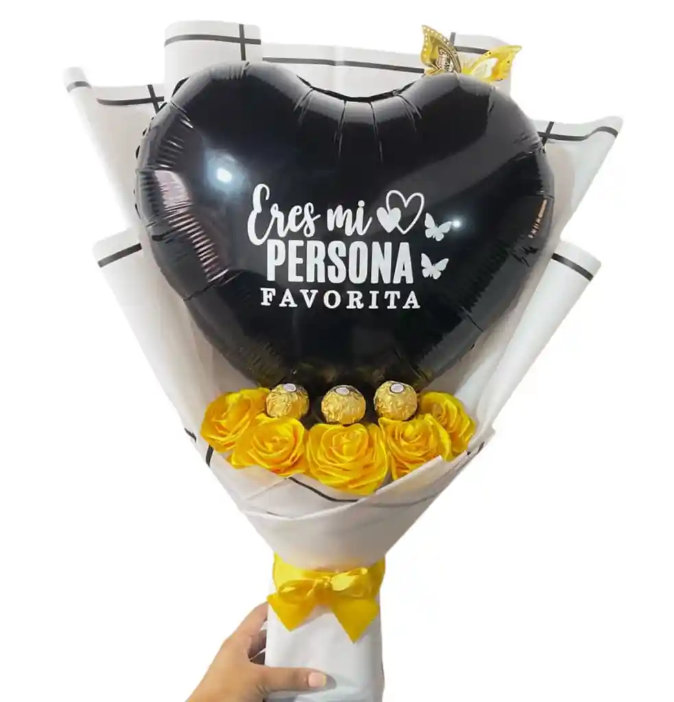 Hermoso bouquet con globo de tu color favorito y personalizado, 5 flores eternas del color de tu elección, tres bombones ferrero rocher, con tarjeta personalizada y lindos apliques que complementes tu detalle
