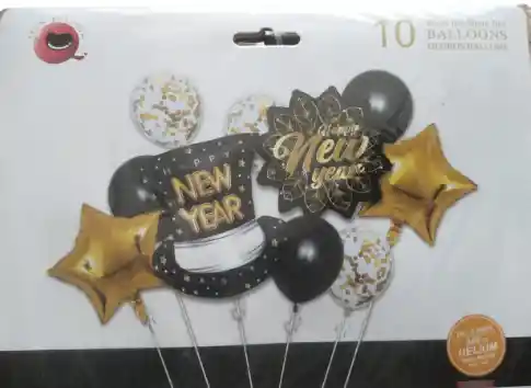 Bouquet Feliz Año Nuevo, viene x 10 globo que incluyen: 2 Globos metalizados estampados HAPPY NEW YEAR, 2 globos metalizado estrellas doradas, 3 Bombas confeti dorado, 3 bombas negras. El producto se envia desinflado. Si desea inflar con helio por favor escribir en el chat del pedido para consultar disponibilidad y costo.