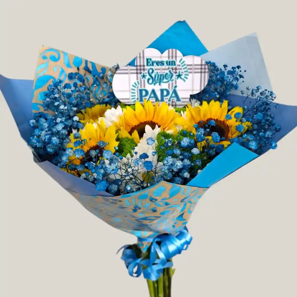 Celebra al héroe de tu vida con nuestro ramo Feliz Dia del Hombre, una vibrante combinación de girasoles, margaritas y gypsophilas azules, envuelto en tonos azules con un toque elegante y masculino. Incluye un pin con el mensaje “Feliz dia ”, ideal para recordarle cuánto lo admiras y lo quieres. ✨ Un detalle lleno de color y amor para hacer sonreír al mejor hombre del mundo.