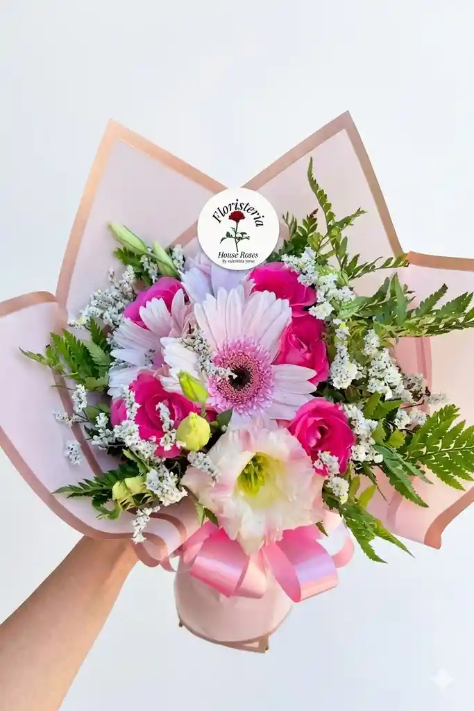 Hermoso arreglo floral en tonos rosados que combina la delicadeza de las gerberas, rosas y lisianthus, acompañado de finos follajes naturales y un elegante envoltorio rosado con lazo decorativo. Un detalle lleno de ternura, perfecto para expresar cariño y sorprender a alguien especial.