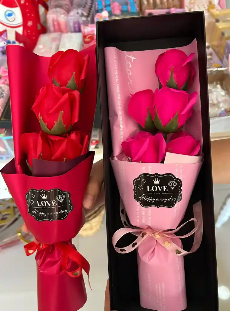 Bouquet Flores Artificiales, con 5 rosas empacadas en caja con acetato con moño.