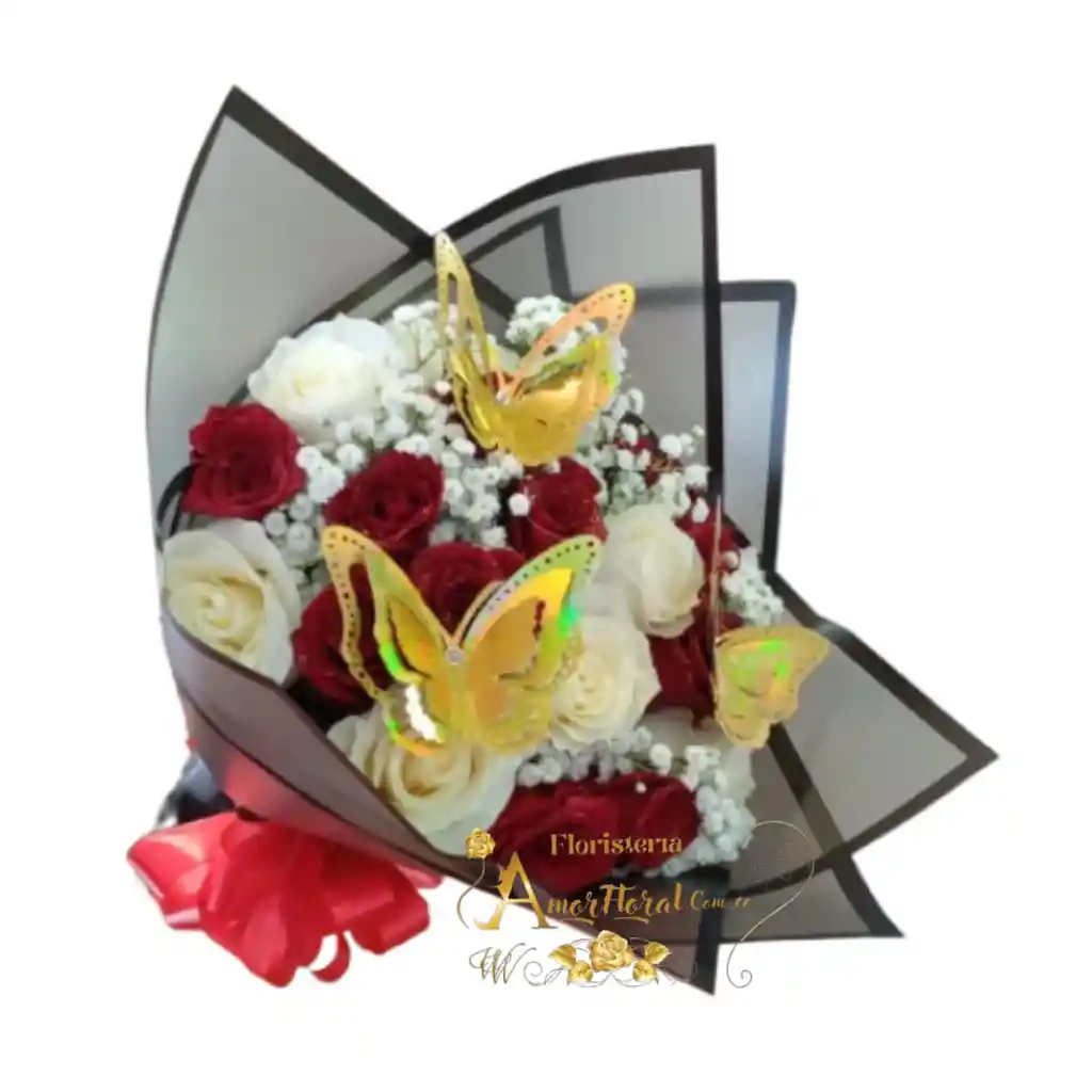 bouquet por 24 rosas, mariposas, si deseas un mensaje para la tarjeta lo puedes dejar escrito en el área de observaciones o escribirnos al whatsapp al 3143111616 y enviarnos el mensaje para la tarjeta.