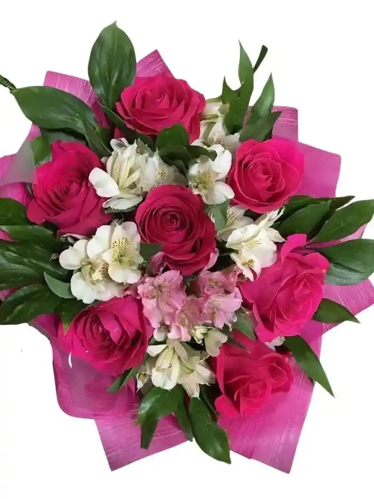 Bouquet de 6 rosas fucsias con 1 paquete mix de astromelia blanca y rosada y 6 varas de rusco . Nota: La flor puede ser sustituida dependiendo la disponibilidad de color y del producto “Mensaje Personalizado” máximo de 30 caracteres (Dejar el mensaje en el chat, los comentarios no se previsualizan para la tienda por lo que si se dejan allí no podrá ser incluido).