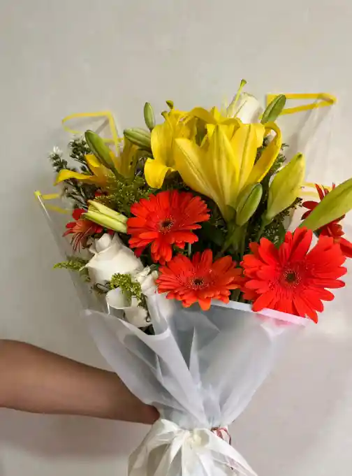 5 lirios + 5 Gerberas + 5 Rosas + Follaje