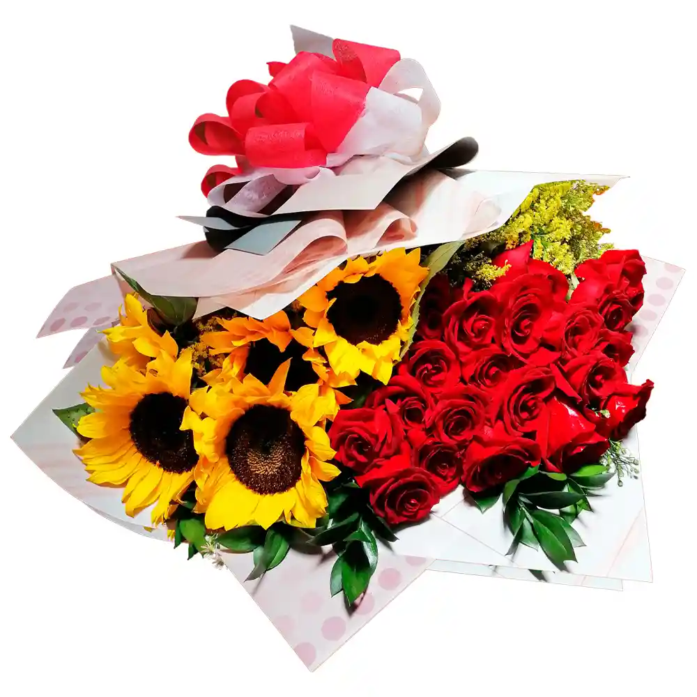 -5 girasoles -24 rosas ecuatorianas -Rusco y solidago -Embalaje en papelillo encerado de colores con moño en cinta de fibra -Tarjeta con tu mensaje (Diligencia el DE PARA y MENSAJE en los comentarios) de color Multicolor ideal para el Felicitaciones