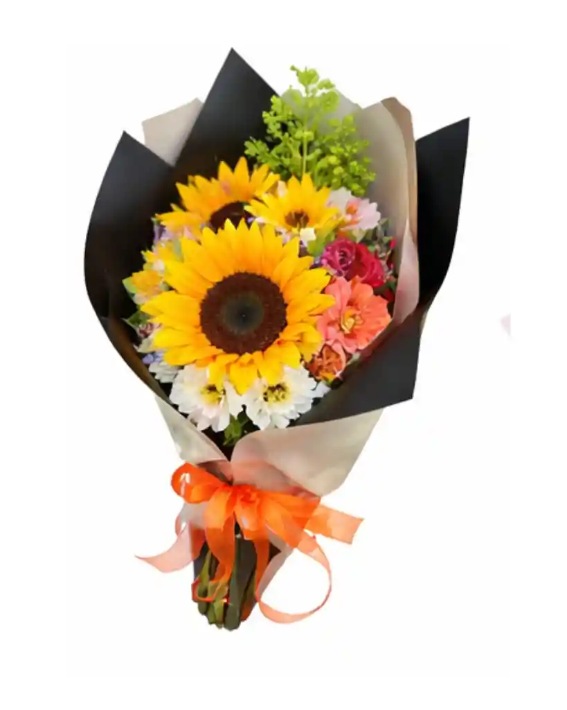 Bouquet colorido con girasoles, margaritas y claveles
