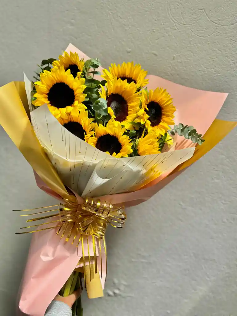 Bouquet de 6 tallos de girasoles naturales con papel decorativo, moño y tarjeta. Es un perfecto detalle para regalar en fechas especiales, decora espacios y brinda elegancia. Su duración es de aproximadamente 10 días. El color del papel decorativo varía de acuerdo a la disponibilidad en tienda.