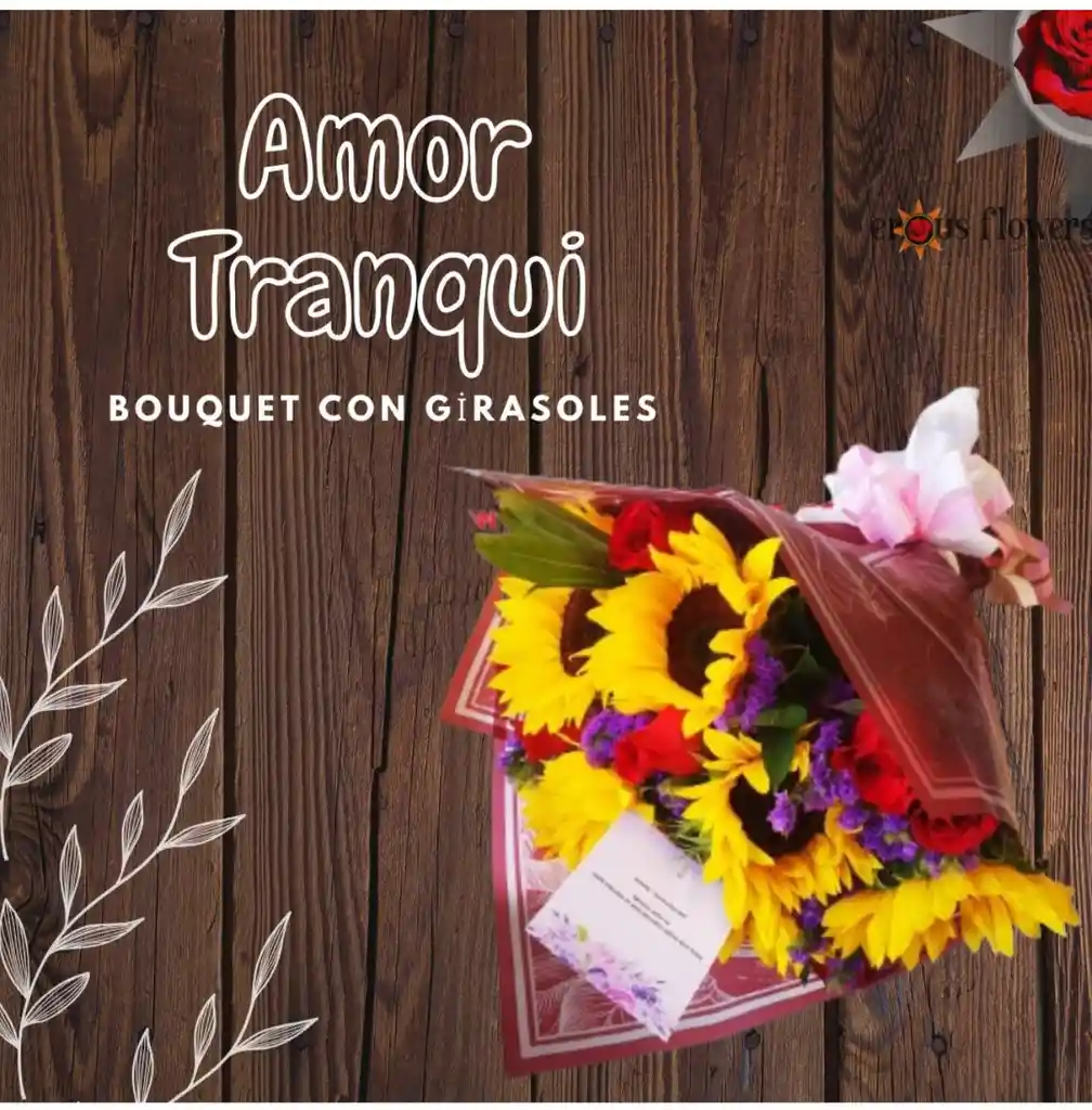 Ramo alegre y delicado con 5 girasoles y 10 rosas, acompañados de follaje, envuelto en papel coreano y terminado con moño, un detalle fresco y especial que incluye mensaje.