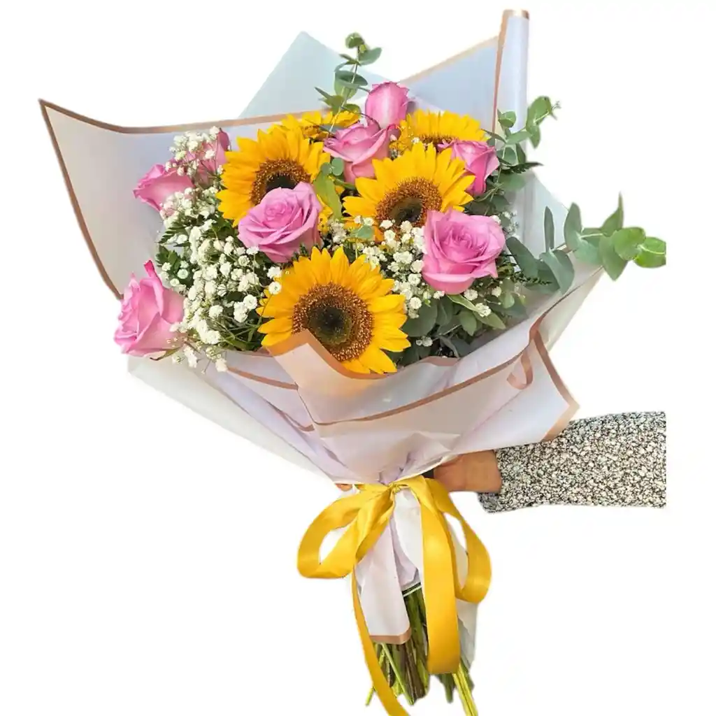 Ramillete compuesto por girasoles vibrantes y rosas rosadas, acompañado de eucalipto y delicada gipsofilia. Envuelto en elegante papel coreano y decorado con un fino lazo, es un diseño romántico y luminoso, ideal para celebrar momentos especiales con alegría y ternura.