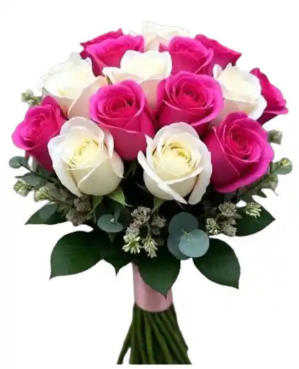 Un bouquet vibrante y sofisticado compuesto por rosas fucsia intensas combinadas con rosas marfil de pétalos suaves, creando un contraste visual encantador y lleno de energía. Acompañado de follaje fresco y detalles decorativos, este diseño ofrece una presentación armónica y moderna, envuelta en un elegante acabado satinado. Ideal para celebraciones especiales, cumpleaños, agradecimientos o para sorprender con un gesto lleno de estilo y personalidad. Su mezcla de tonos vivos y neutros lo convierte en una pieza llamativa, femenina y memorable.