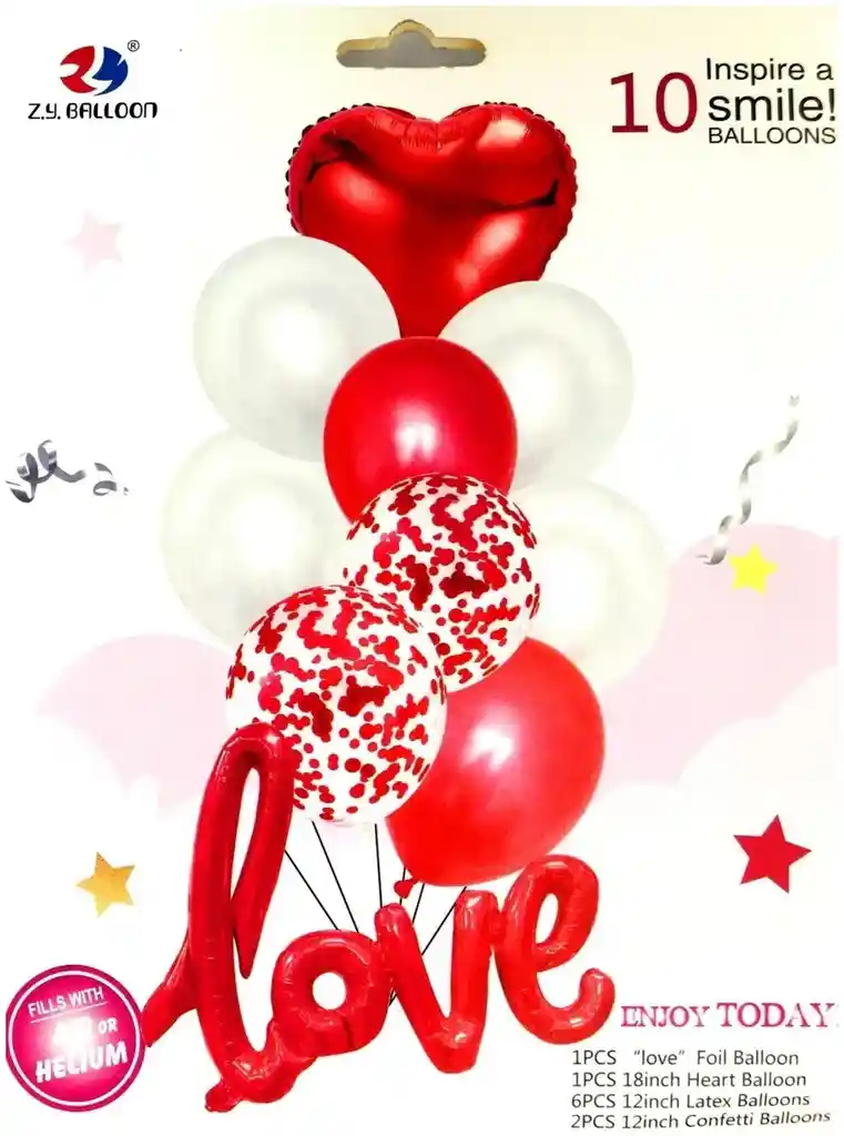 *********************GLOBOS Y PELUCHES MASMELO********************* Por tu compra Llevas: 1 Set de 10 globos que consta de: 1 Globo letrero LOVE rojo 108x65cm 1 Globo metalizado corazón 45x45 Rojo 2 Globo latex de 30cm con confetti Rojo 4 Globo latex de 30cm blanco liso 2 Globo latex de 30cm oro Rojo 1 cinta para amarrar globos *Los globos se entregan desinflados, tu compra no incluye el montaje ni la decoración, el servicio de armado no lo tenemos disponible. sin embargo te damos todas las instrucciones para hacer de modo profesional. Si deseas adicionar otros articulos a tu compra puedes escribirnos, recuerda que Somos Globos y Peluches Masmelo ;) - En ciudades fuera de Bogotá despachamos para el mismo día si compras antes de las 11AM (no incluye festivos) - En Bogotá despachamos para el mismo día, si haces el pedido antes de las 4PM (no incluye festivos)