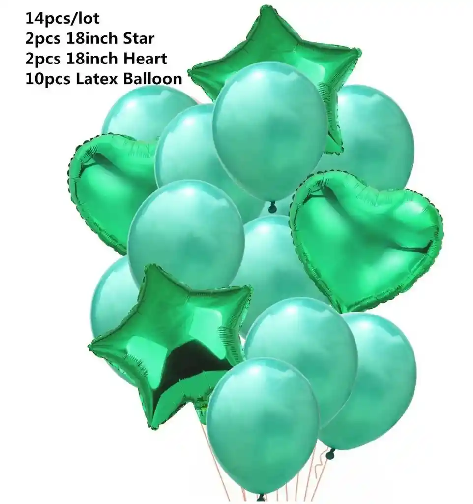 *********************GLOBOS Y PELUCHES MASMELO********************* Por tu compra Llevas: 1 Set de 14 globos que consta de: 2 Globo metalizado estrella 45x45 verde 2 Globo metalizado corazón 45x45 verde 5 Globo latex de 30cm con confetti verde 5 Globo latex de 30cm verde liso 1 cinta para amarrar globos *Los globos se entregan desinflados, tu compra no incluye el montaje ni la decoración, el servicio de armado no lo tenemos disponible. sin embargo te damos todas las instrucciones para hacer de modo profesional. Si deseas adicionar otros articulos a tu compra puedes escribirnos, recuerda que Somos Globos y Peluches Masmelo ;) - En ciudades fuera de Bogotá despachamos para el mismo día si compras antes de las 11AM (no incluye festivos) - En Bogotá despachamos para el mismo día, si haces el pedido antes de las 4PM (no incluye festivos)