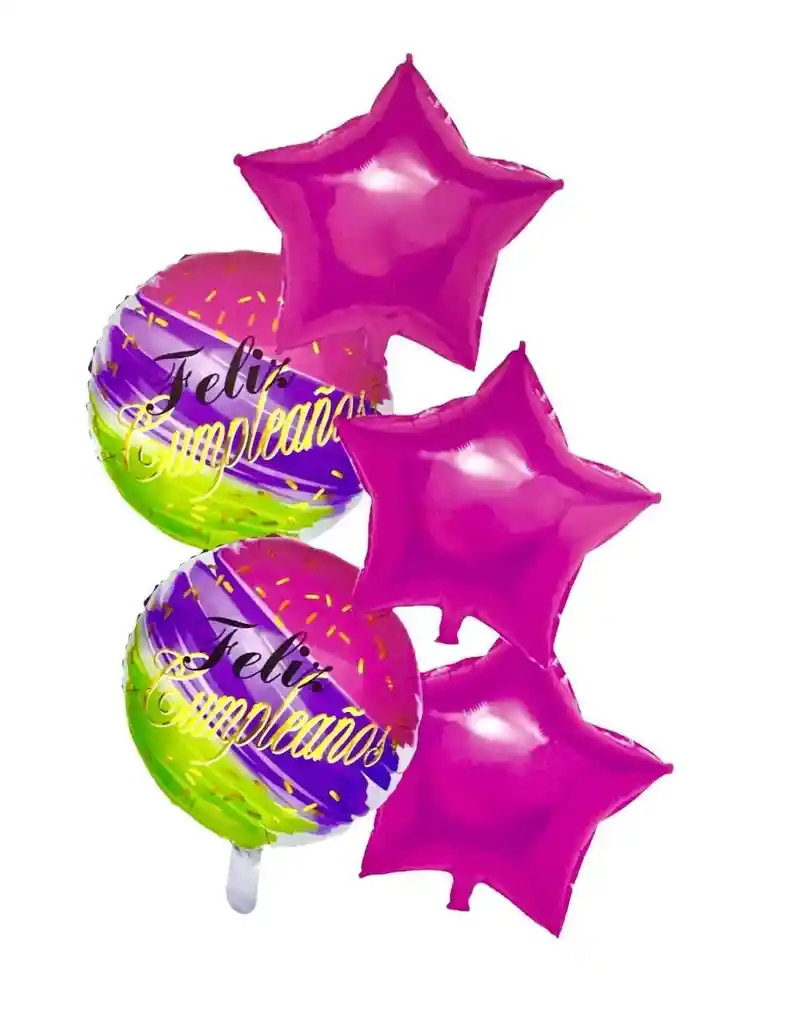 Bouquet Globo Metalizado 5 Piezas. Contiene 3 estrellas fucsia, 2 globos redondos Feliz Cumpleaños
