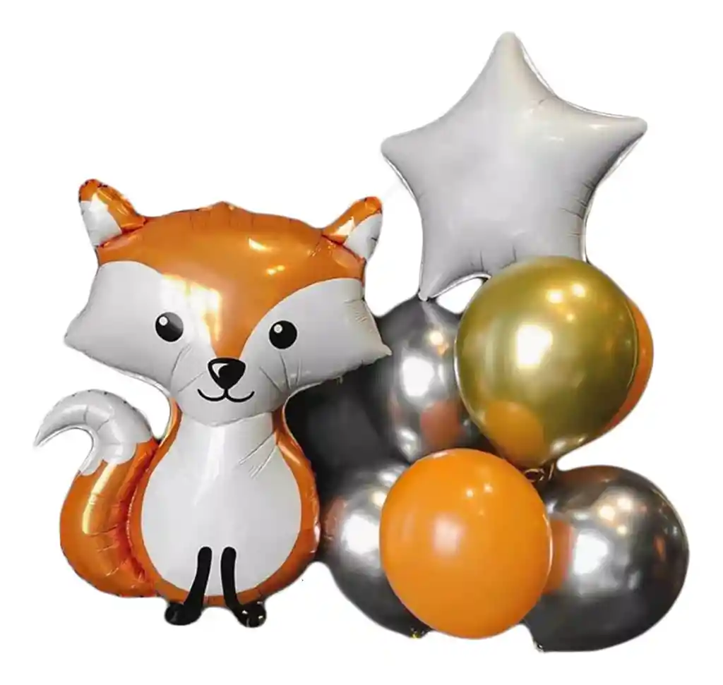 *********************GLOBOS Y PELUCHES MASMELO********************* Por tu compra te llevas. 1 Globo zorro 65x45cm 1 Globo estrella 45×45 cm 2 Globo cromado dorado 30 cm 4 Globo plateado cromado 30 cm 2 Globo naranja 30 cm Los globos se entregan desinflados, tu compra no incluye el montaje ni la decoración, el servicio de armado no lo tenemos disponible. sin embargo te damos todas las instrucciones para hacerlo de modo profesional. Si deseas adicionar otros articulos a tu compra puedes escribirnos, recuerda que Somos Globos y Peluches Masmelo Si necesitas variación en los colores, colocar un número, más globos o realizar otros cambios en el diseño original escribenos para ver si podemos hacerlo. Tenemos todo lo necesario para tus decoraciones, somos lo último en tendencias mundiales decorativas. Tenemos disponible: Vasos, platos, manteles, guirnaldas, cubiertos, globos de todo tipo, números, letreros, vela, Etc. Puedes encontrar los articulos de nuestra tienda en el siguiente link, copia y pega, si no encuentas lo que necesitas escribenos: https://www.rappi.com.co/tiendas/900280040-globosypeluchesmasmelo-mt-enc/decoracion-para-fiestas/globos-y-bombas