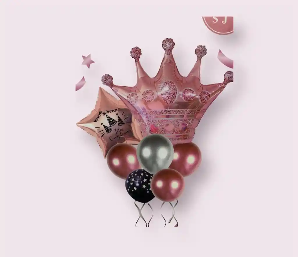 BOUQUET GLOBOS BOMBA CORONA "FELIZ CUMPLEAÑOS" X7PCS COLOR ORO ROSA