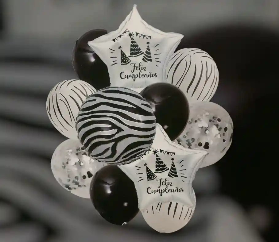 BOUQUET GLOBOS BOMBAS AGATA ESTRELLAS FELIZ CUMPLEAÑOS NEGRO ZEBRAX11PCS