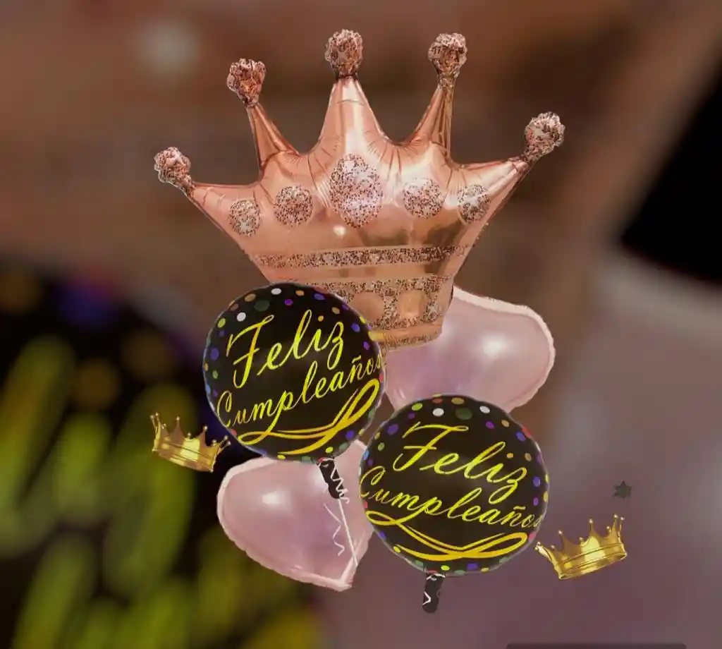 BOUQUET GLOBOS BOMBAS CORONA "FELIZ CUMPLEAÑOS" X5PCS COLOR ORO ROSA
