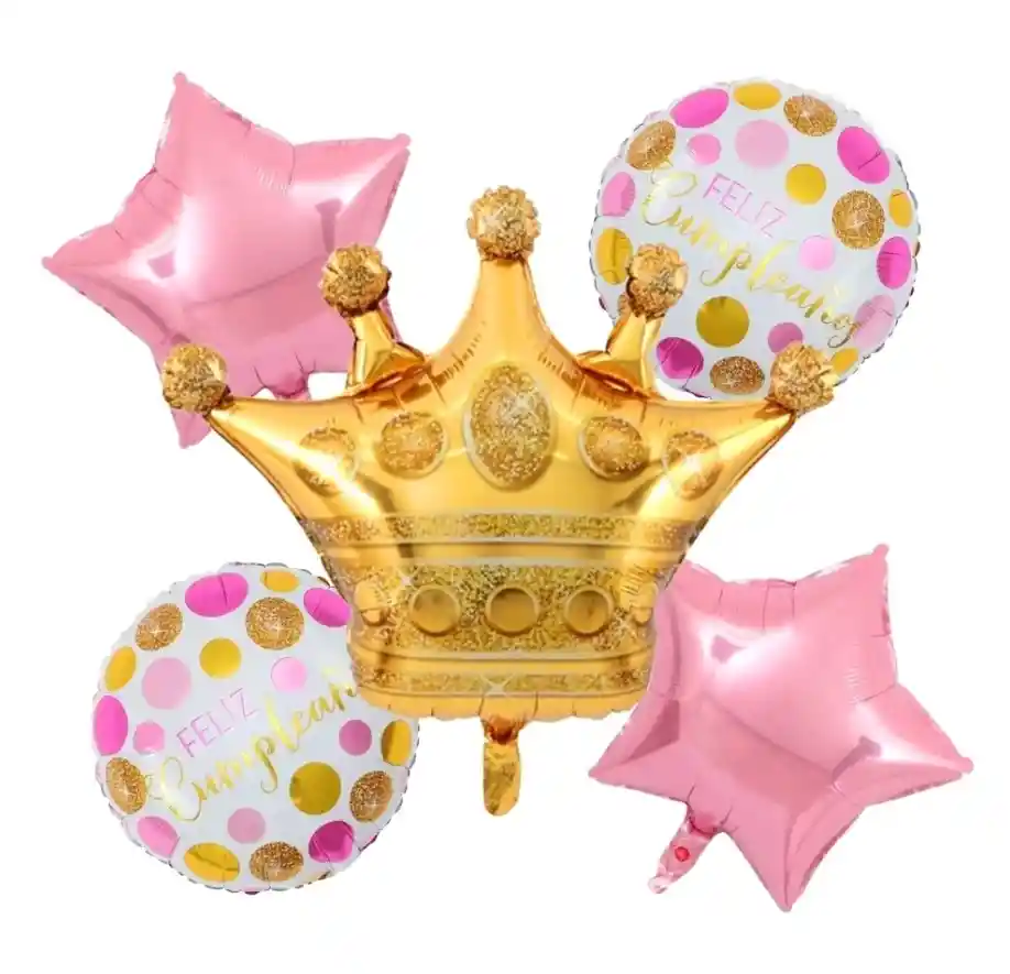 Bouquet Globos Bombas Coronas Feliz Cumpleaños X5 pcs De Color Rosado Con Dorado