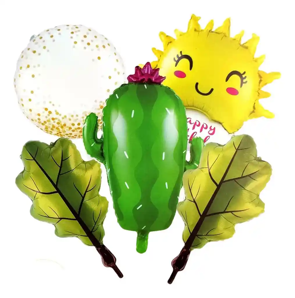 *********************GLOBOS Y PELUCHES MASMELO********************* ————————–Somos Mercado Líder Platinum———————— Por tu compra Llevas: 1 Globo cactus 65x45cm 2 Globo hoja 45 x 35 cm 1 Globo sol feliz 45 x45 cm 1 Globo circular confeti 45 x45 cm *Los globos se entregan desinflados, tu compra no incluye el montaje ni la decoración, el servicio de armado no lo tenemos disponible. sin embargo te damos todas las instrucciones para hacer de modo profesional. Si deseas adicionar otros artículos a tu compra puedes escribirnos, recuerda que Somos Globos y Peluches Masmelo Si necesitas variación en los colores, colocar un número, más globos o realizar otros cambios en el diseño original escríbenos para ver si podemos hacerlo. Tenemos todo lo necesario para tus decoraciones, somos lo último en tendencias mundiales decorativas. Tenemos disponible: Vasos, platos, manteles, guirnaldas, cubiertos, globos de todo tipo, números, letreros, vela, Etc. Puedes encontrar los artículos de nuestra tienda en el siguiente link, copia y pega, si no encuentras lo que necesitas escríbenos: https://www.rappi.com.co/tiendas/900280040-globosypeluchesmasmelo-mt-enc/decoracion-para-fiestas/globos-y-bombas
