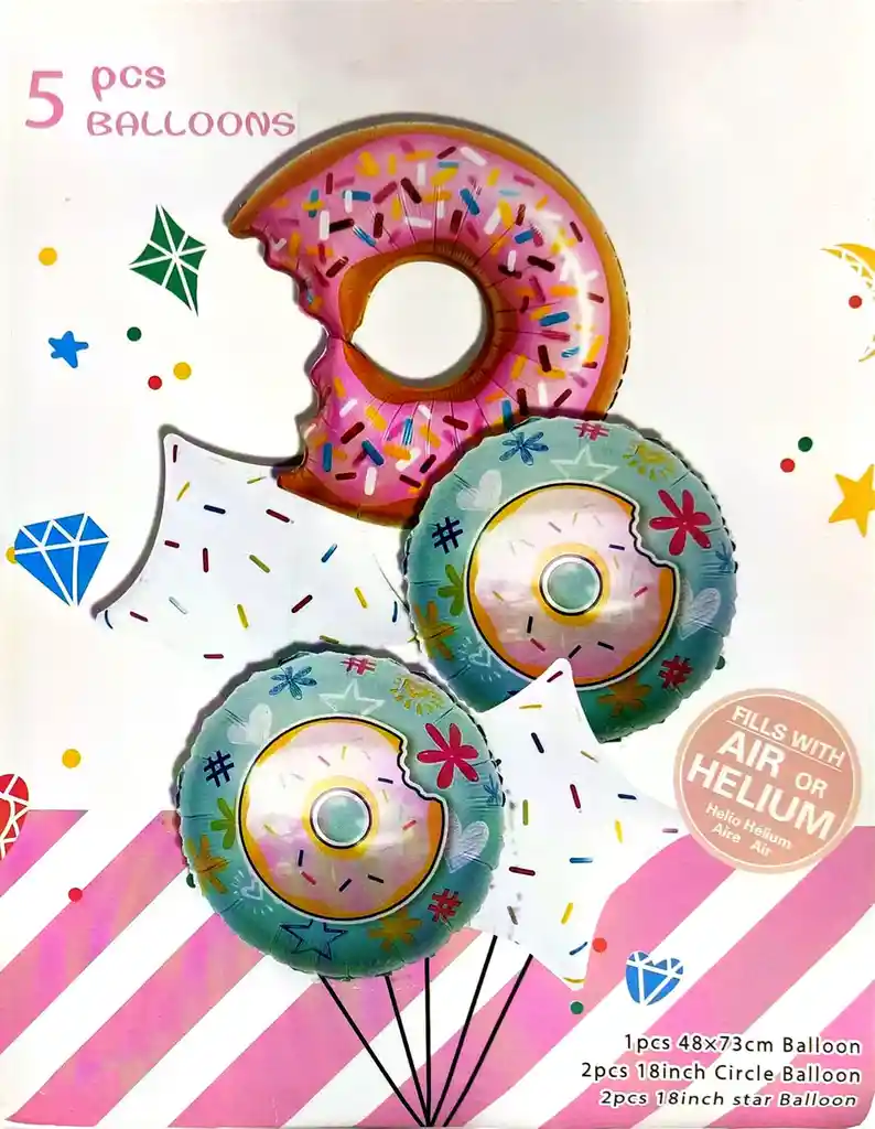 *********************GLOBOS Y PELUCHES MASMELO********************* ————————–Somos Mercado Líder Platinum———————— Por tu compra Llevas: 1 Globo dona 65x65cm 2 Globo circular dona 45x45cm 2 Globo estrellas con chispas 45x45cm *Los globos se entregan desinflados, tu compra no incluye el montaje ni la decoración, el servicio de armado no lo tenemos disponible. sin embargo te damos todas las instrucciones para hacer de modo profesional. Si deseas adicionar otros artículos a tu compra puedes escribirnos, recuerda que Somos Globos y Peluches Masmelo Si necesitas variación en los colores, colocar un número, más globos o realizar otros cambios en el diseño original escríbenos para ver si podemos hacerlo. Tenemos todo lo necesario para tus decoraciones, somos lo último en tendencias mundiales decorativas. Tenemos disponible: Vasos, platos, manteles, guirnaldas, cubiertos, globos de todo tipo, números, letreros, vela, Etc. Puedes encontrar los artículos de nuestra tienda en el siguiente link, copia y pega, si no encuentras lo que necesitas escríbenos: https://www.rappi.com.co/tiendas/900280040-globosypeluchesmasmelo-mt-enc/decoracion-para-fiestas/globos-y-bombas