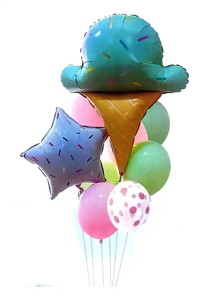 *********************GLOBOS Y PELUCHES MASMELO********************* Por tu compra te llevas: 1 Globo helado 60cm 1 Globo estrella 45x45cm 5 Globos surtidos de colores R12 *Los globos se entregan desinflados, tu compra no incluye el montaje ni la decoración, el servicio de armado no lo tenemos disponible. sin embargo te damos todas las instrucciones para hacer de modo profesional. Si deseas adicionar otros articulos a tu compra puedes escribirnos, recuerda que Somos Globos y Peluches Masmelo Si necesitas variación en los colores, colocar un número, más globos o realizar otros cambios en el diseño original escribenos para ver si podemos hacerlo. Tenemos todo lo necesario para tus decoraciones, somos lo último en tendencias mundiales decorativas. Tenemos disponible: Vasos, platos, manteles, guirnaldas, cubiertos, globos de todo tipo, números, letreros, vela, Etc. Puedes encontrar los articulos de nuestra tienda en el siguiente link, copia y pega, si no encuentas lo que necesitas escribenos: https://www.rappi.com.co/tiendas/900280040-globosypeluchesmasmelo-mt-enc/decoracion-para-fiestas/globos-y-bombas