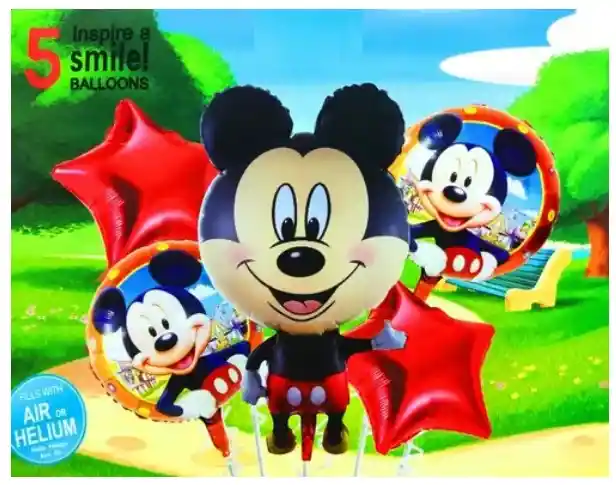 2 Globo estrella metalizada rojo 45x45cm 2 Globo circular temática mickey mouse 45x45cm 1 Globo Mickey Mouse 47x85cm *Los globos se entregan desinflados