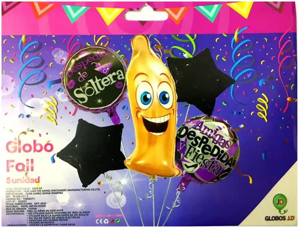 *********************GLOBOS Y PELUCHES MASMELO********************* Por tu compras llevas: 1 Globo pene con condon 40x90 cm 2 Globo estrella metalizada negra 45x45cm 2 Globo despedida de soltera 45x45cm *Los globos se entregan desinflados, tu compra no incluye el montaje ni la decoración, el servicio de armado no lo tenemos disponible. sin embargo te damos todas las instrucciones para hacer de modo profesional. Si deseas adicionar otros articulos a tu compra puedes escribirnos, recuerda que Somos Globos y Peluches Masmelo ;) - En ciudades fuera de Bogotá despachamos para el mismo día si compras antes de las 11AM (no incluye festivos) - En Bogotá despachamos para el mismo día, si haces el pedido antes de las 4PM (no incluye festivos)