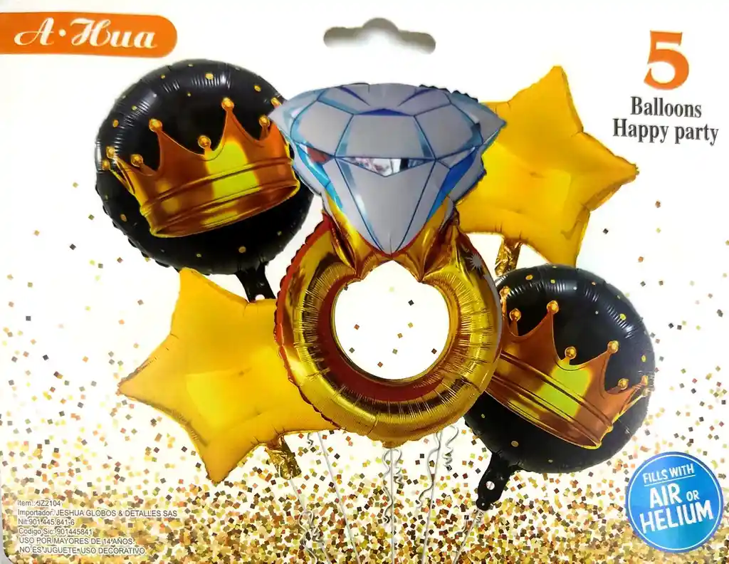 *********************GLOBOS Y PELUCHES MASMELO********************* Por tu compra te llevas. 2 Globo estrella dorado 45x45cm 2 Globo circulo negro corona 45x45cm 1 Globo anillo 60x40cm *Los globos se entregan desinflados, tu compra no incluye el montaje ni la decoración, el servicio de armado no lo tenemos disponible. sin embargo te damos todas las instrucciones para hacer de modo profesional. Si deseas adicionar otros articulos a tu compra puedes escribirnos, recuerda que Somos Globos y Peluches Masmelo Si necesitas variación en los colores, colocar un número, más globos o realizar otros cambios en el diseño original escribenos para ver si podemos hacerlo. Tenemos todo lo necesario para tus decoraciones, somos lo último en tendencias mundiales decorativas. Tenemos disponible: Vasos, platos, manteles, guirnaldas, cubiertos, globos de todo tipo, números, letreros, vela, Etc. Puedes encontrar los articulos de nuestra tienda en el siguiente link, copia y pega, si no encuentas lo que necesitas escribenos: https://www.rappi.com.co/tiendas/900280040-globosypeluchesmasmelo-mt-enc/decoracion-para-fiestas/globos-y-bombas