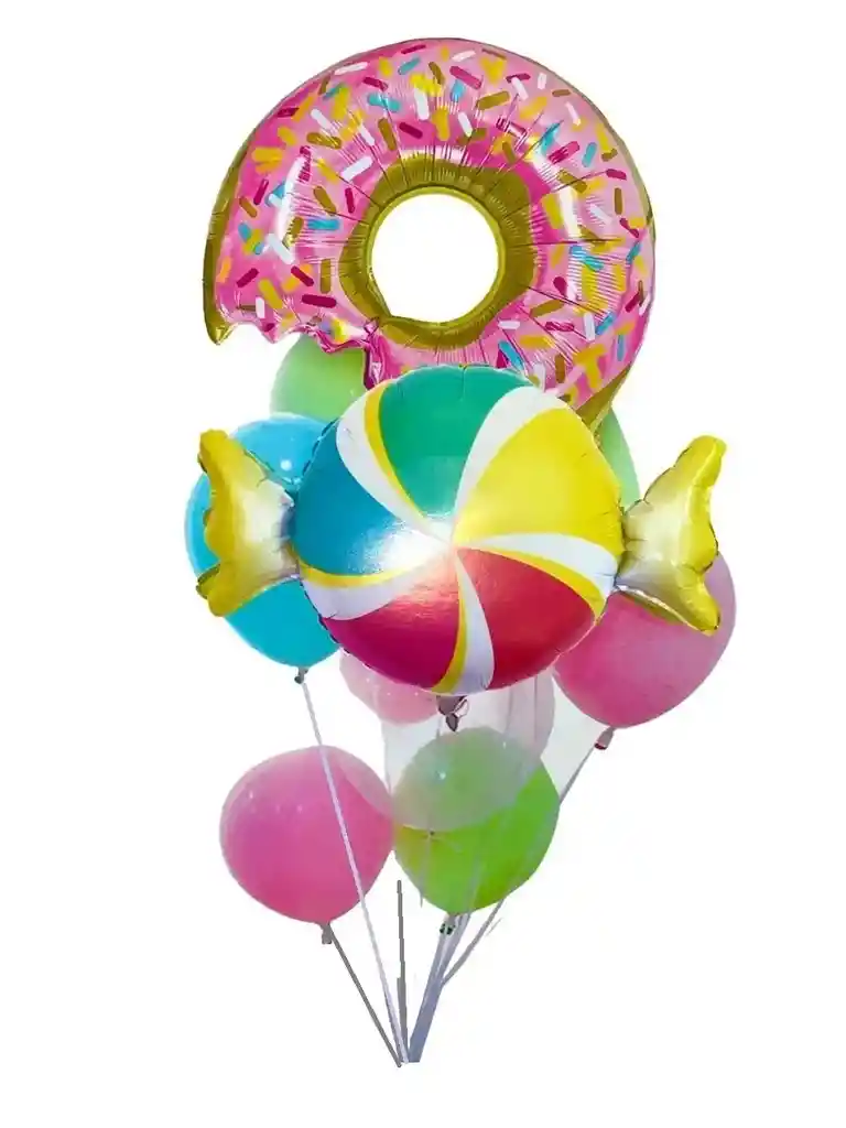 Bouquet Globos Dona Dulce Candy 9 Piezas. Contiene 1 Globo metalizado de 48x68 cm, 1 Globo metalizado dona 44x70cm, 7 Globos latex r12