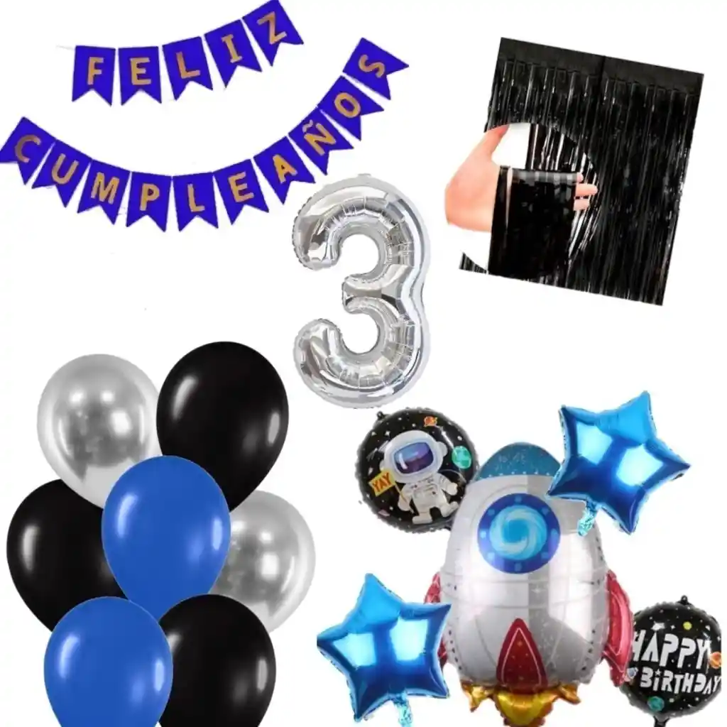 *********************GLOBOS Y PELUCHES MASMELO********************* Somos Mercado Líder Platinum Por tu compra te llevas: 1 Globo cohete 65x45cm 1 Globo cortina negro 2x1 metros 1 Globo número plateado 82 cm de altura número según tu elección 4 Globo azul rey 30cm 4 Globo negro 30cm 4 Globo plateado 30cm 2 Globo circular temática espacial 45x45cm 2 Globo estrella azul 45x45cm 1 Festón azul feliz cumpleaños 2 metros