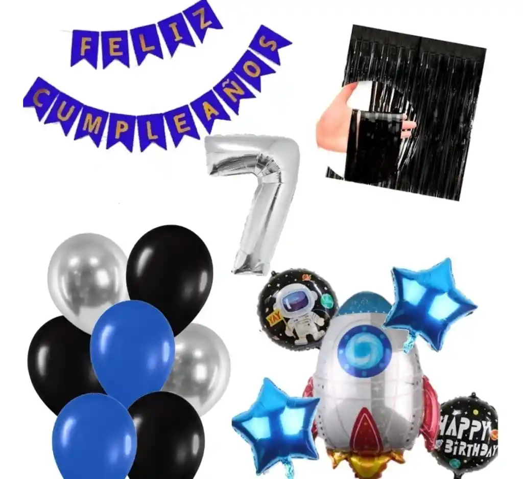 *********************GLOBOS Y PELUCHES MASMELO********************* Somos Mercado Líder Platinum Por tu compra te llevas: 1 Globo cohete 65x45cm 1 Globo cortina negro 2x1 metros 1 Globo número plateado 82 cm de altura número según tu elección 4 Globo azul rey 30cm 4 Globo negro 30cm 4 Globo plateado 30cm 2 Globo circular temática espacial 45x45cm 2 Globo estrella azul 45x45cm 1 Festón azul feliz cumpleaños 2 metros