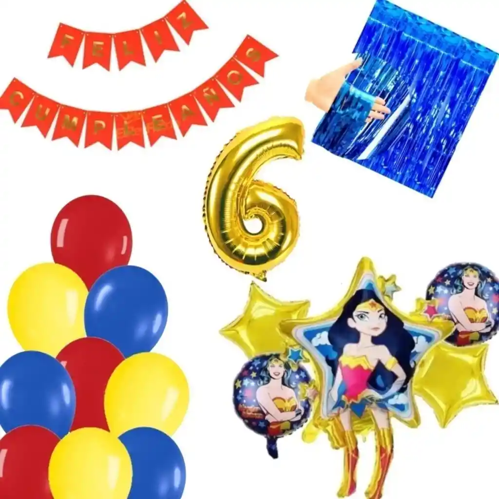*********************GLOBOS Y PELUCHES MASMELO********************* Somos Mercado Líder Platinum Por tu compra te llevas: 1 Globo mujer maravilla 65x45cm 1 Cortina azul flecos 2x1 metros 1 Festón rojo 2 metros de largo 4 Globo rojo 30cm 4 Globo amarillo 30cm 4 Globo azul 30cm 1 Globo número dorado 82 cm 2 Globo estrella dorado 82cm 2 Globo circular temática mujer Maravilla 65x45cm