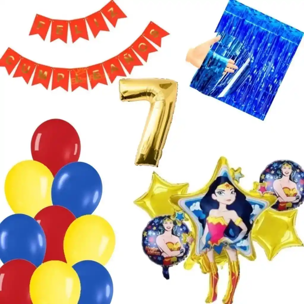 *********************GLOBOS Y PELUCHES MASMELO********************* Somos Mercado Líder Platinum Por tu compra te llevas: 1 Globo mujer maravilla 65x45cm 1 Cortina azul flecos 2x1 metros 1 Festón rojo 2 metros de largo 4 Globo rojo 30cm 4 Globo amarillo 30cm 4 Globo azul 30cm 1 Globo número dorado 82 cm 2 Globo estrella dorado 82cm 2 Globo circular temática mujer Maravilla 65x45cm
