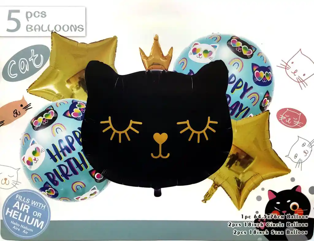 *********************GLOBOS Y PELUCHES MASMELO********************* ————————–Somos Mercado Líder Platinum———————— Por tu compra Llevas: 1 Globo gato negro 55x45 cm 2 Globo circular feliz cumpleaños 45x45cm 2 Globo estrella dorada 45x45cm *Los globos se entregan desinflados, tu compra no incluye el montaje ni la decoración, el servicio de armado no lo tenemos disponible. sin embargo te damos todas las instrucciones para hacer de modo profesional. Si deseas adicionar otros artículos a tu compra puedes escribirnos, recuerda que Somos Globos y Peluches Masmelo Si necesitas variación en los colores, colocar un número, más globos o realizar otros cambios en el diseño original escríbenos para ver si podemos hacerlo. Tenemos todo lo necesario para tus decoraciones, somos lo último en tendencias mundiales decorativas. Tenemos disponible: Vasos, platos, manteles, guirnaldas, cubiertos, globos de todo tipo, números, letreros, vela, Etc. Puedes encontrar los artículos de nuestra tienda en el siguiente link, copia y pega, si no encuentras lo que necesitas escríbenos: https://www.rappi.com.co/tiendas/900280040-globosypeluchesmasmelo-mt-enc/decoracion-para-fiestas/globos-y-bombas