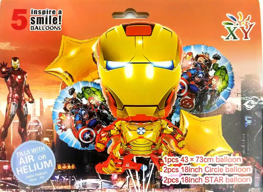 *********************GLOBOS Y PELUCHES MASMELO********************* Por tu compra te llevas. 2 Globo estrella dorado 45x45cm 2 Globo circulo temática avengers 45×45 cm 1 Globo Iron man 43x73cm *Los globos se entregan desinflados, tu compra no incluye el montaje ni la decoración, el servicio de armado no lo tenemos disponible. sin embargo te damos todas las instrucciones para hacer de modo profesional. Si deseas adicionar otros articulos a tu compra puedes escribirnos, recuerda que Somos Globos y Peluches Masmelo Si necesitas variación en los colores, colocar un número, más globos o realizar otros cambios en el diseño original escribenos para ver si podemos hacerlo. Tenemos todo lo necesario para tus decoraciones, somos lo último en tendencias mundiales decorativas. Tenemos disponible: Vasos, platos, manteles, guirnaldas, cubiertos, globos de todo tipo, números, letreros, vela, Etc. Puedes encontrar los articulos de nuestra tienda en el siguiente link, copia y pega, si no encuentas lo que necesitas escribenos: https://www.rappi.com.co/tiendas/900280040-globosypeluchesmasmelo-mt-enc/decoracion-para-fiestas/globos-y-bombas