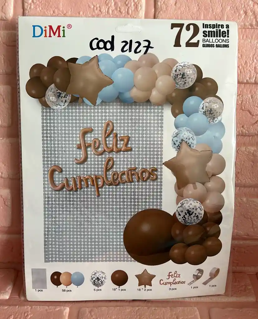 BOUQUET GLOBOS KIT CUMPLEAÑOS 72 PIEZAS CAFE/NUDE/AZUL CLARO COD.2127 (( GLOBOS-CORTINA-LETRERO -ETC )) INCLUYE: 1 CORTINA DE CUADROS 58 GLOBOS R-12 5 GLOBOS CONFETI R-12 1 GLOBO R-18 2 ESTRELLAS METALIZADAS 1 LETRERO FELIZ CUMPLEAÑOS 1 CINTA PARA UNIR GLOBOS 1 CINTA PUNTOS DOBLE FAZ