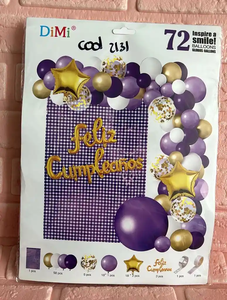 BOUQUET GLOBOS KIT CUMPLEAÑOS 72 PIEZAS MORADO/LILA/BLANCO/DORADO COD.2131 (( GLOBOS-CORTINA-LETRERO -ETC )) INCLUYE: 1 CORTINA DE CUADROS 58 GLOBOS R-12 5 GLOBOS CONFETI R-12 1 GLOBO R-18 2 ESTRELLAS METALIZADAS 1 LETRERO FELIZ CUMPLEAÑOS 1 CINTA PARA UNIR GLOBOS 1 CINTA PUNTOS DOBLE FAZ
