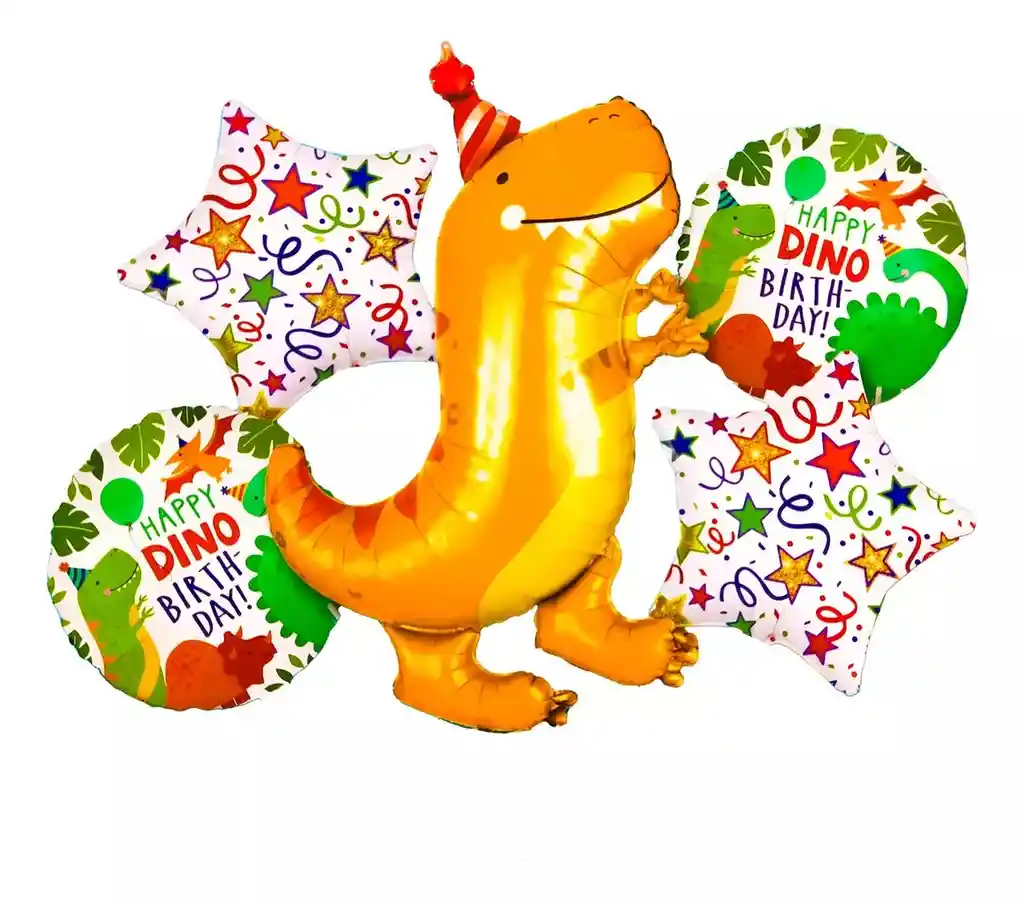 *********************GLOBOS Y PELUCHES MASMELO********************* Somos Mercado Líder Platinum Por tu compra te llevas: 1 Globo dinosaurio rex naranja igual a la foto 70x50cm 2 Globo circular feliz dinocumpleaños 45x45cm 2 Globo estrella fiesta cumpleaños 45x45cm *Los Globos se entregan desinflados, tu compra no incluye el montaje ni la decoración, el servicio de armado no lo tenemos disponible. sin embargo te damos todas las instrucciones para hacer de modo profesional. Si deseas adicionar otros artículos a tu compra puedes escribirnos, recuerda que Somos Globos y Peluches Masmelo Si necesitas variación en los colores, colocar un número, más Globos o realizar otros cambios en el diseño original escríbenos para ver si podemos hacerlo. Tenemos todo lo necesario para tus decoraciones, somos lo último en tendencias mundiales decorativas. Tenemos disponible: Vasos, platos, manteles, guirnaldas, cubiertos, Globos de todo tipo, números, letreros, vela, Etc.