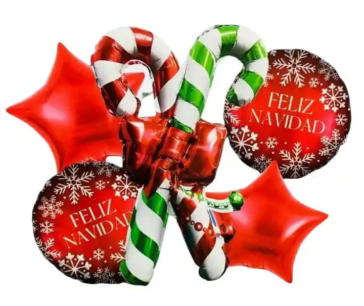 Bouquet Globos Metalizados 5 Piezas Navidad Bastones. SE ENVÍA DESINFLADO. Para inflar sus globos metalizados o globos de látex, tenemos disponible en nuestra tienda el INFLADOR MANUAL. No olvide incluirlo en su pedido.